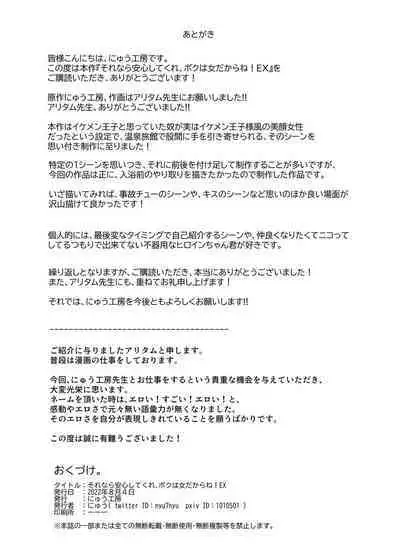 Sorenara Anshin Shite Kure, Boku wa Onna dakara ne! EX Ikemen da to Omotteitara Ikemen-fuu Bigan Joshi Datta Koitsu to Totsuzen Konyoku Suru Ken | Then You Shouldn't Worry, Because I'm a Girl! Ex! [にゅう工房 ( にゅう工房、アリタム )] それなら安心してくれ、ボクは女だからね!EX イケメンだと思っていたらイケメン風美顔女子だったコイツと突然混浴する件 [英訳]